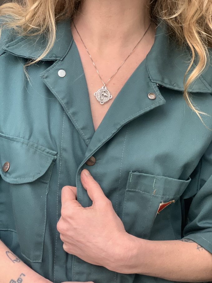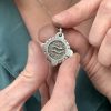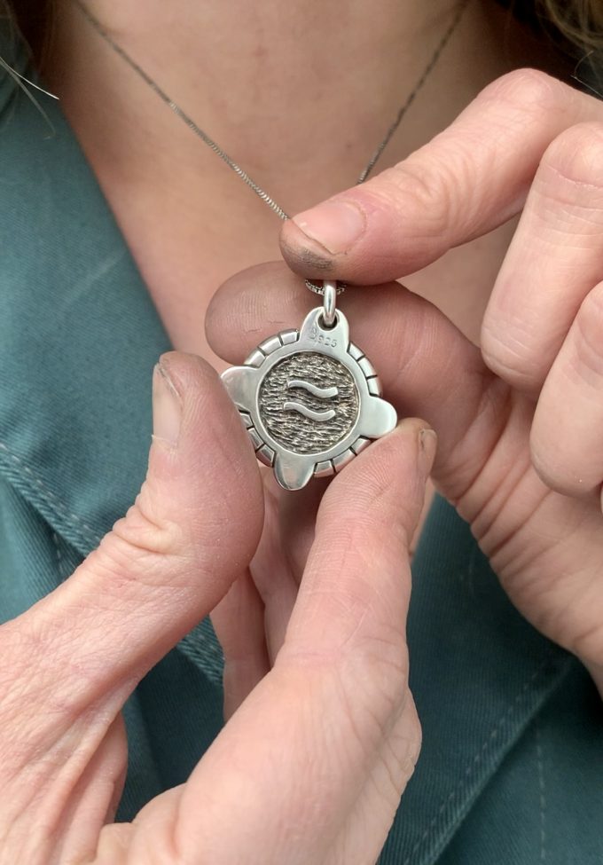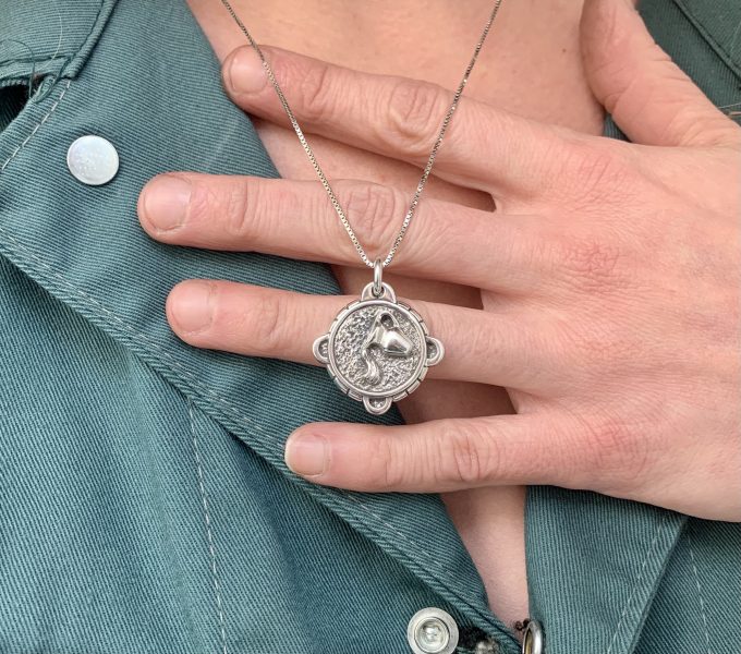 The Aquarius zodiac medallion is handcrafted in sterling silver, available in gold by special order.