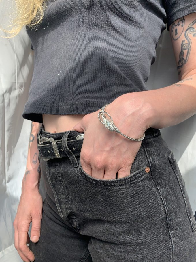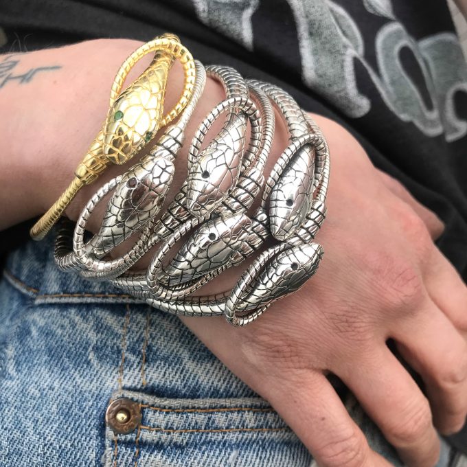 The Snake & Noose bangle is handcrafted in solid sterling silver, the Snake tail tapers into a rope, a metamorphosis noose looping around the snake neck. Available in gold and with stones in the eye at request, for all custom inquiries email anita@anitasikma.com