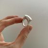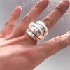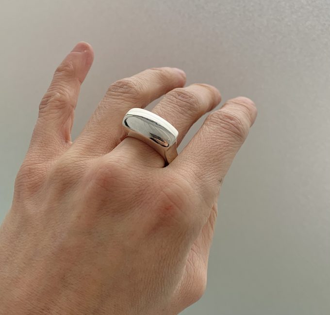 The “Tops Ring”is hand crafted in solid sterling silver and hand carved to order, making each ring uniquely one of a kind. The smooth polish and extended top slope to an elegantly rounded band.