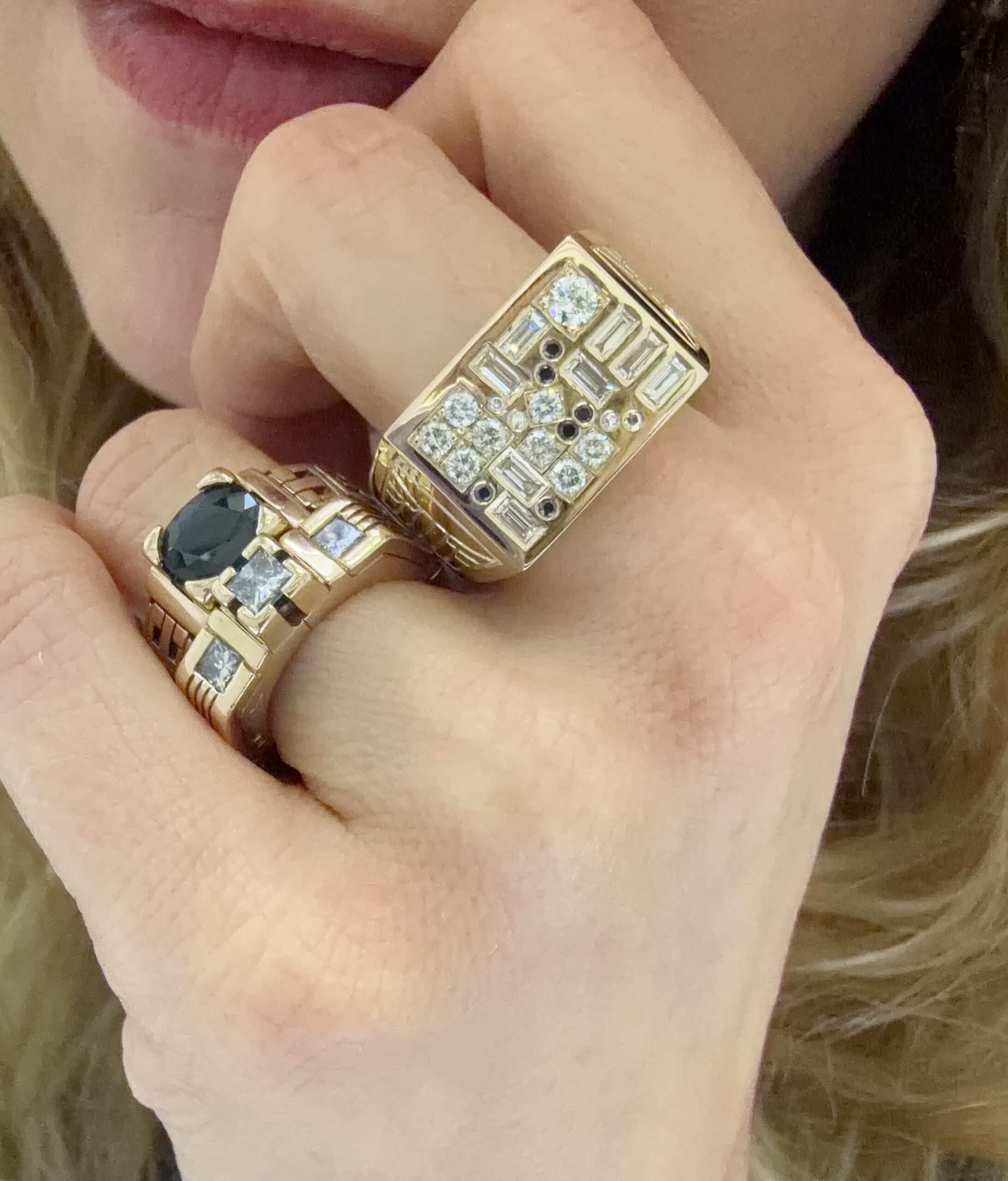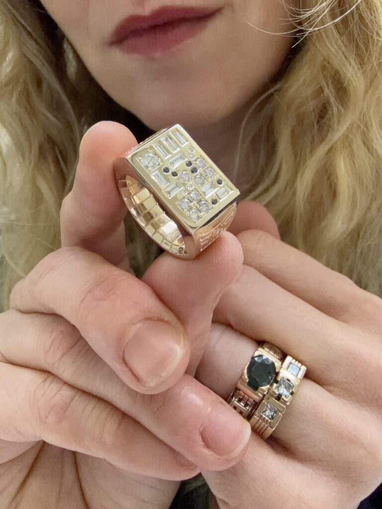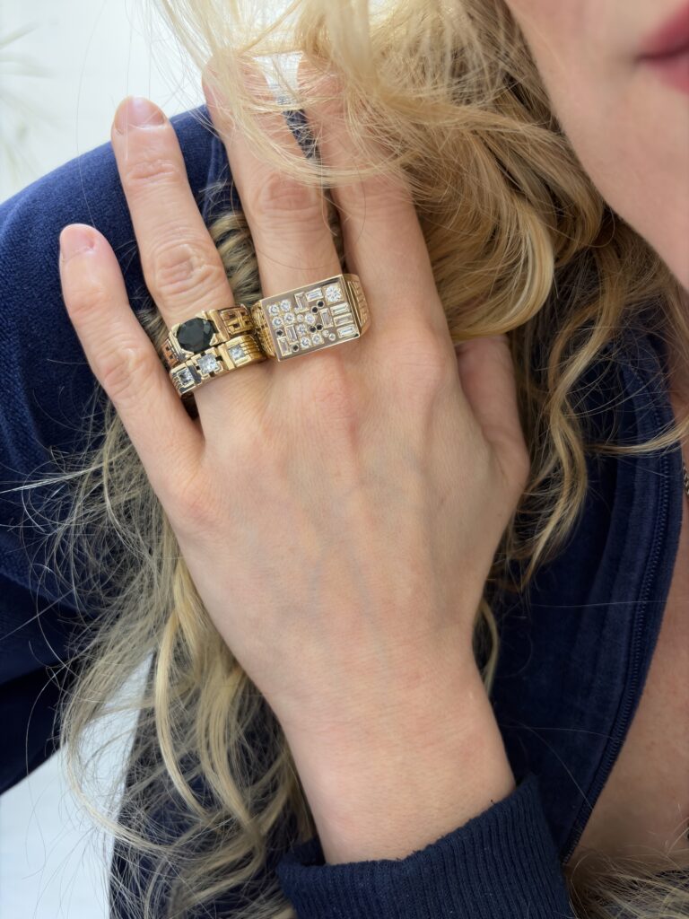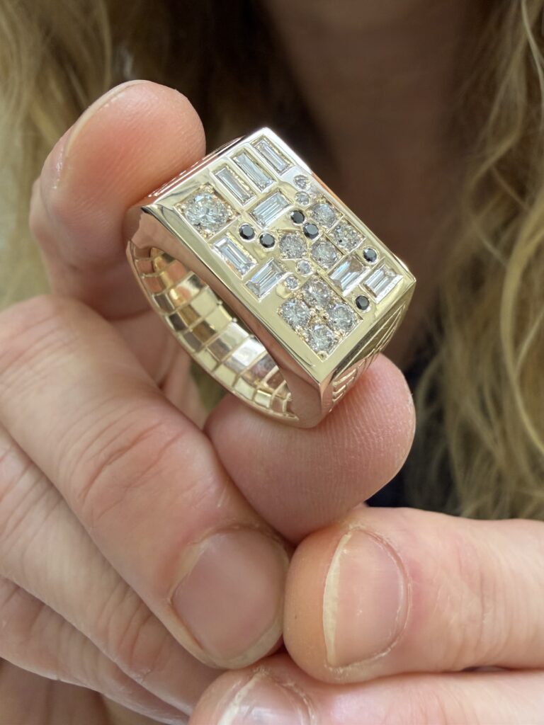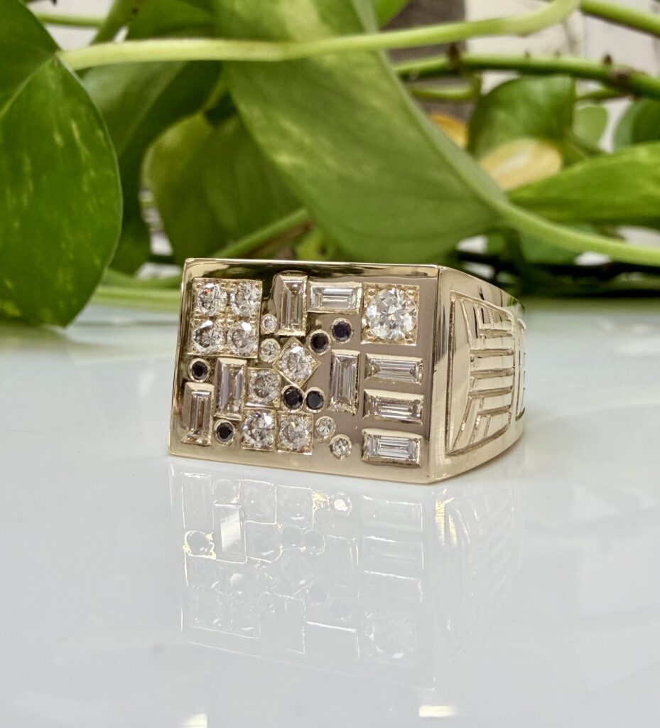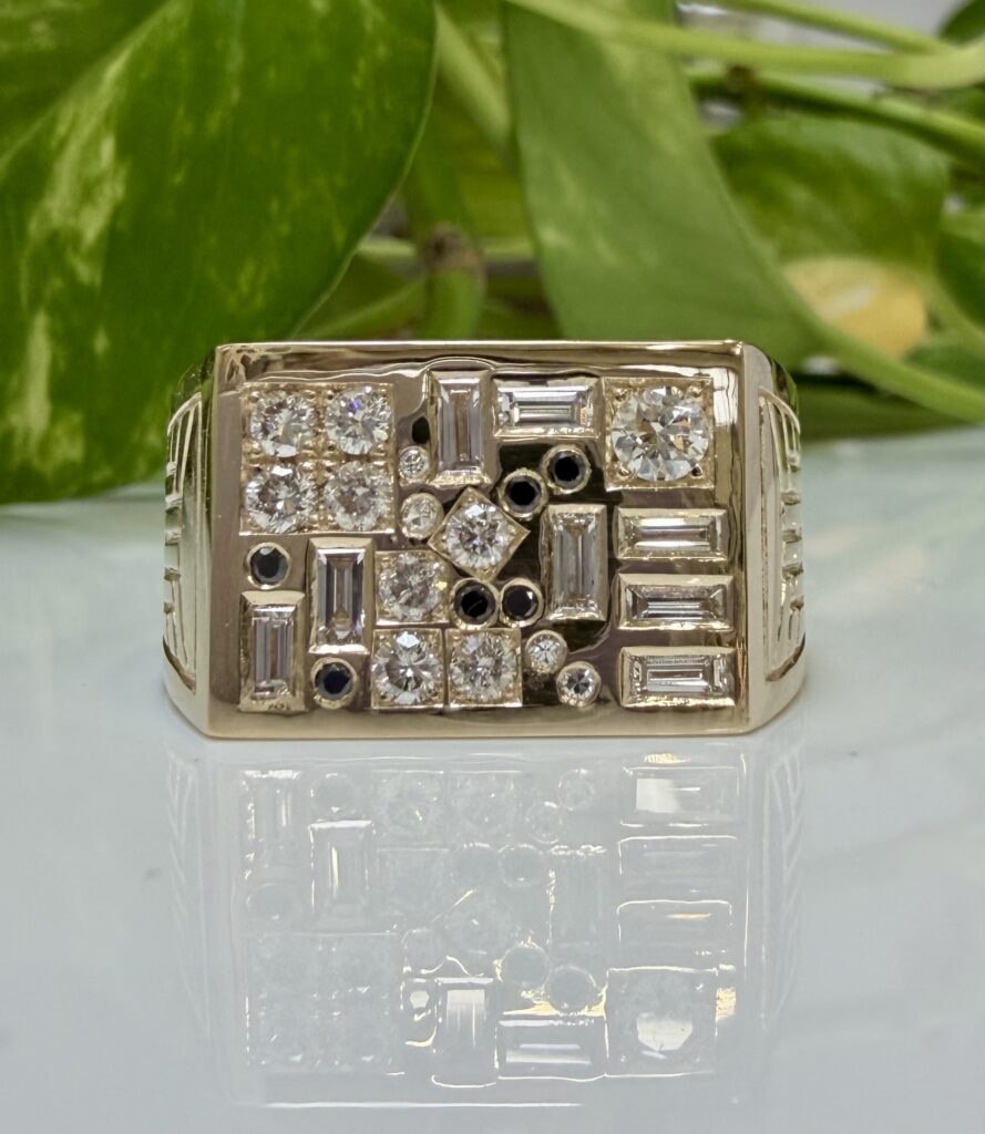 Custom 14K yellow gold ring with heirloom black and white diamonds, 2026
