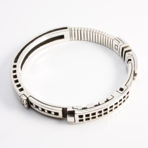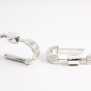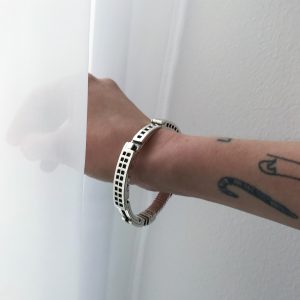 The “KC Chain” necklace is a handcrafted in solid sterling silver, connected by two automotive hose clamps redesigned to replicate hand cuffs. The “KC” cuffs are locked in the front of the chain, the chain is connected along the back with a “S Hook”.